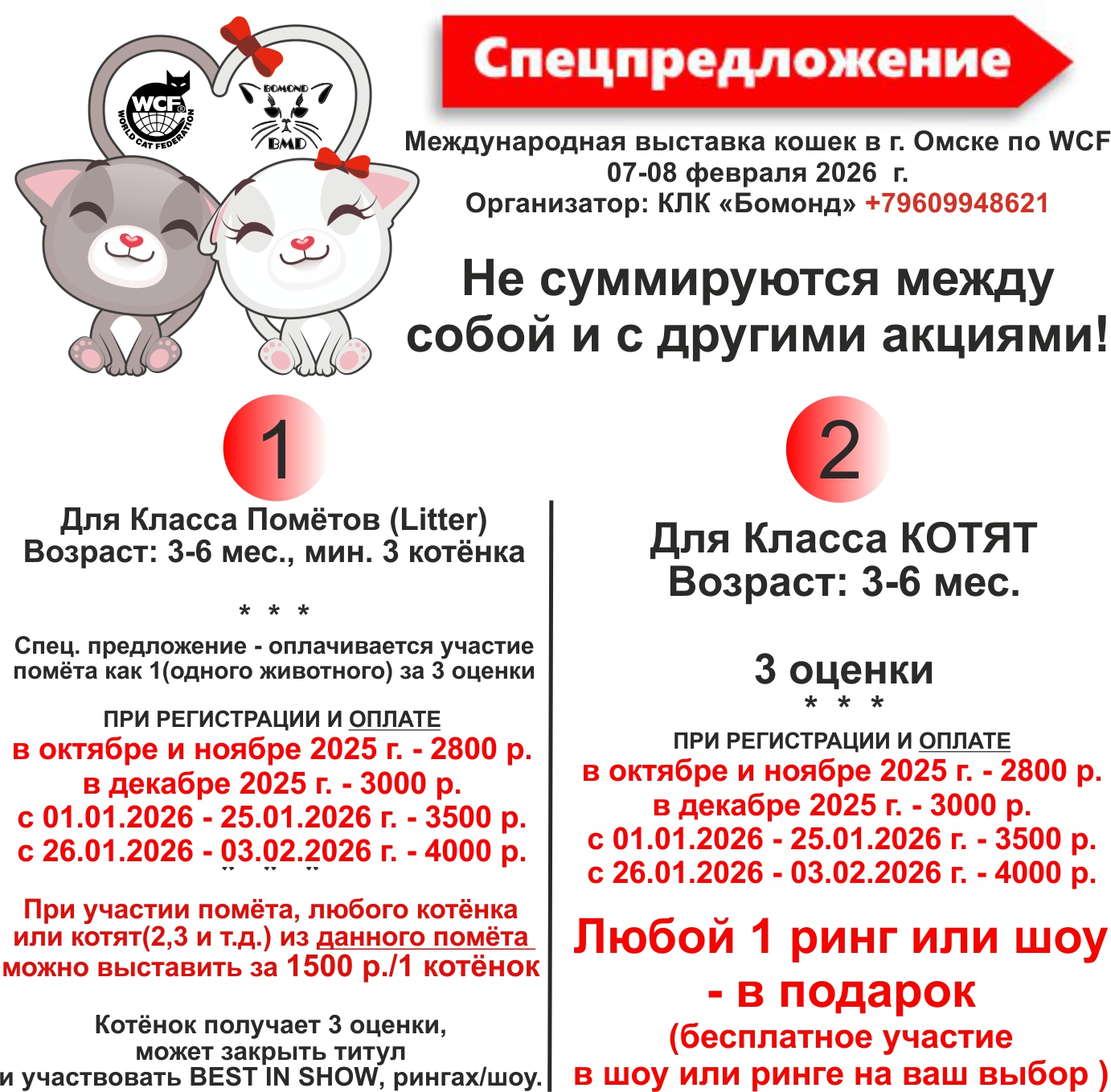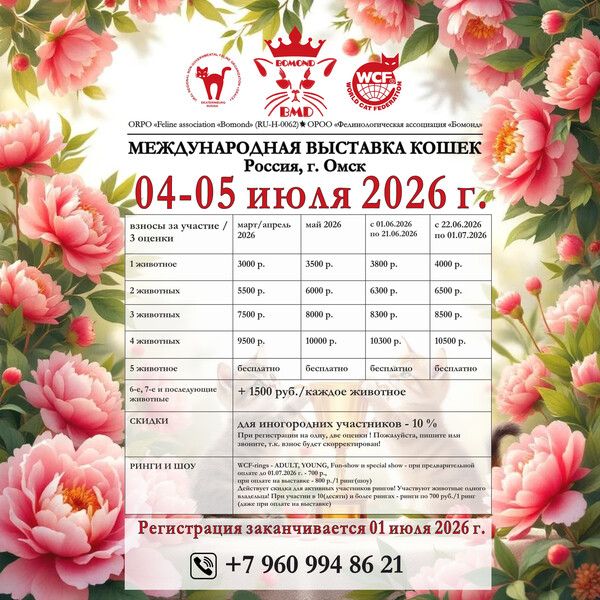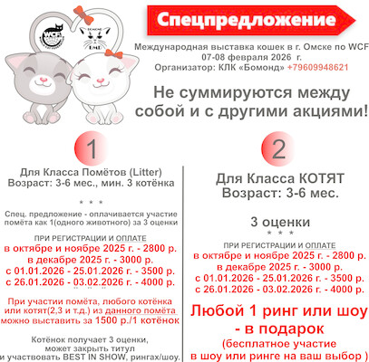 Вместе с выставляемым животным (котята с возраста 3 мес. и не более 3-х котят) – бесплатно! Заявки на участие – только предварительные.